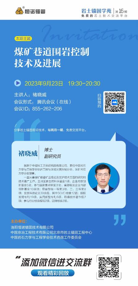 巖土錨固學苑將于2023年9月23日(周六)19:30-20:30舉辦第16期,本期主題:煤礦巷道圍巖控制技術及進展,歡迎廣大巖土錨固領域愛好者參與交流。