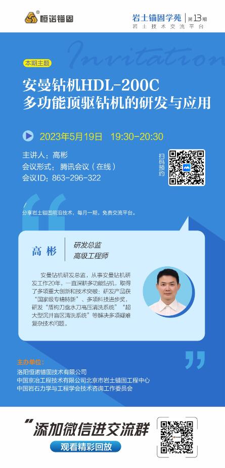 • 巖土錨固學苑將于2023年5月19日(周五)19:30-20:30舉辦第13期,本期主題:安曼鉆機HDL-200C多功能頂驅鉆機的研發與應用,歡迎廣大巖土錨固領域愛好者參與交流。