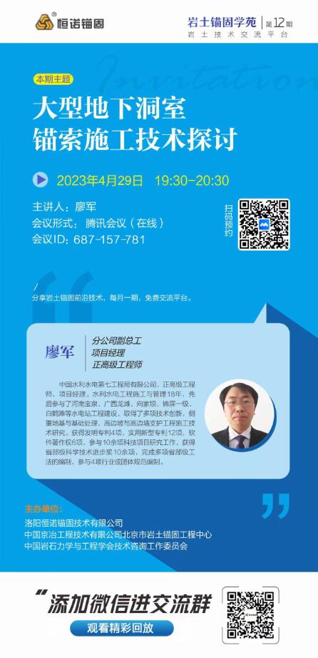 • 巖土錨固學苑將于2024年3月23日(周六)19:30-20:30舉辦第12期,本期主題:大型地下洞室錨索施工技術探討,歡迎廣大巖土錨固領域愛好者參與交流。