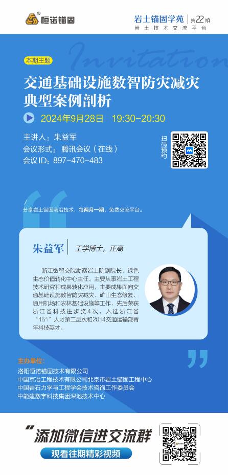 •     巖土錨固學苑將于2024年9月28日(周六)19:30-20:30舉辦第21期,本期主題:交通基礎設施數智防災減災典型案例剖析,歡迎廣大巖土錨固領域愛好者參與交流。