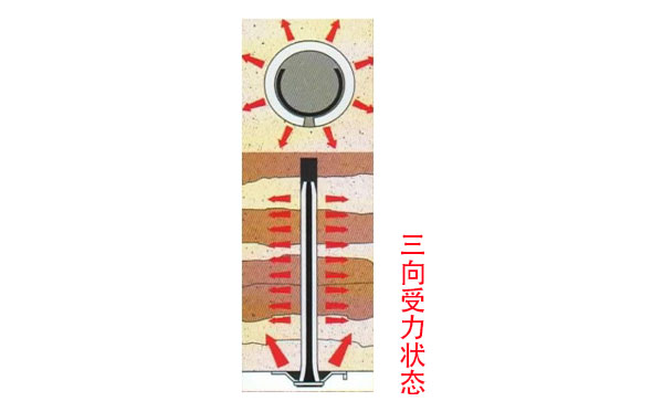 比如管縫式錨桿,在安裝完成后,可立即在全長范圍內對孔壁施加徑向壓力,并產生阻止圍巖下滑的摩擦力,加上錨桿托盤托板的承托力,這三種力的綜合作用使圍巖處于三向受力狀態。在這種狀態下,圍巖的強度和自承能力得到提高,巖體摩擦阻力增大,應力分布和應力狀態得到改善。三向受力狀態使得圍巖能夠更好地抵抗變形和破壞,從而保持巷道或工程結構的穩定性。